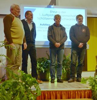 Auch im sportlichen Bereich gab es Erfolge zu vermelden. Die 1. Luftpistolenmannschaft (Gerald Bauer, Viktor Bauer, Dieter Stiller, Gerhard Ziegler) des Schützenvereins Schwanfeld gelang der Aufstieg von der Gauliga in die Bezirksliga Ost des Schützenbezirks Schweinfurt und das mit einer beeindruckenden Bilanz. Es wurden alle Vergleichswettkämpfe gewonnen. Für diesen Erfolg überreichte die Bürgermeisterin Krein die mittlerweile schon bekannten Schwanfelder Vitaminkörbe an die Schützen.
