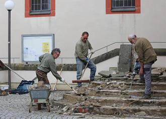 Die Außentreppe am Hauptportal der Kirche St. Michael wird saniert. Die erforderlichen Vorarbeiten wurden im Ehrenamt von fleißigen Männern geleistet, die zwei Tage geschuftet haben. Auf dem Foto von Dr. Ekkehard Römmelt sind zu sehen Thomas Hertlein, Erwin Martin und Reinhard Sauer. Sie wurden tatkräftig von Richard Strobel und Wolfgang Stühler unterstützt. Herzlichen Dank für dieses Engagement für die Kirchengemeinschaft und unsere Gemeinde./LK