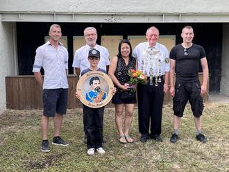 Von links nach rechts: Andre Wunderling (Gemeinderat), Erwin Meyer (scheidender Schützenkönig), Lisa Strobel, Wolfgang Strobel (Schützenkaiser), Michael Kossner (1. Schützenmeister); Vorne: Arthur Rumpel (mit der Schützenscheibe des scheidenden Schützenköings)
