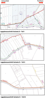 Das Staatliche Bauamt nimmt die von der Gemeinde Schwanfeld festgelegte Trasse „Variante D“ (in rot eingezeichnet) auf. Der Abschnitt entlang der St 2270 zwischen den Gemarkungen Waigolshausen und Schwanfeld wird mit einer Ausbaubreite von 2,50 m als reiner Radweg ausgebaut.