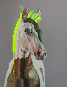 Sie malt detailverliebt mit Acryl auf Spanplatte. Brüche aus dem fokussierten Farbauftrag hin zu mutigen, expressiven Pinselstrichen zeigen dabei stets die Bewegung zwischen zwei Extremen, dem stillen Innehalten eines wertvollen Augenblicks und energischer Lebendigkeit.