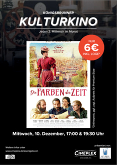 Das Königsbrunner KULTURKINO findet immer am 2. Mittwoch im Monat im Cineplex, Bürgermeister-Wohlfarth-Straße 81, zum vergünstigten Preis von nur 6,00 Euro inkl. Loge statt (Onlinepreis, Kinokasse 7,00 Euro, ggf. zzgl. Aufpreis für Premiumsitze). Alle, die den Termin verpasst haben, können den Film auch noch im Nachgang an weiteren Terminen sehen – dann jedoch zum regulären Eintrittspreis.