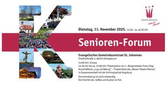 Am Dienstag, 11. November 2025, findet ab 14:30 Uhr das nächste Senioren-Forum im Gemeindesaal St. Johannes, Friedhofstraße 2, statt. Zum zweiten Mal lädt der „Runde Tisch Senioren“ zu der Veranstaltung ein, die in Zusammenarbeit mit der Stadt Königsbrunn im jährlichen Wechsel mit dem SENIOREN aktiv-Tag organisiert wird.