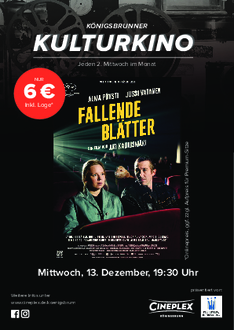 Das Königsbrunner KULTURKINO findet immer am 2. Mittwoch im Monat um 19:30 Uhr im Cineplex, Bürgermeister-Wohlfarth-Straße 81, zum vergünstigten Preis von nur 6,- € inkl. Loge statt (Onlinepreis, Kinokasse 6,50 €, ggf. zzgl. Aufpreis für Premiumsitze). Alle Interessierten, die den Termin verpasst haben, haben die Möglichkeit, den Film auch noch im Nachgang an weiteren Terminen zu sehen – dann jedoch zum regulären Eintrittspreis.