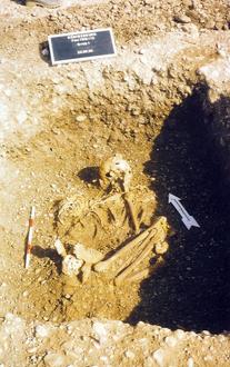 Bei dem Toten handelt es sich um einen etwa 1,80 m großen Mann. Am rechten Unterarm zeigt eine krumm zusammengewachsene Stelle einen alten Bruch. Die Toten der Glockenbecher-Kultur blicken immer nach Osten. Frauen liegen mit dem Kopf nach Süden auf der rechten Körperseite, Männer mit dem Kopf nach Norden auf der linken Körperseite. (Arbeitskreis Vor- und Frühgeschichte (ABK-Süd))