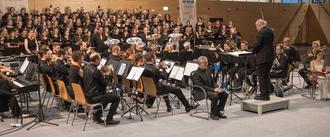 Der Projektchor des Augsburger Sängerkreises gemeinsam mit der 3BA Concert Band beim großen Jubiläumskonzert in der Mehrzweckhalle Stadtbergen.