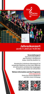 es ist wieder so weit: Der gemischte Chor Vox Corona aus Königsbrunn lädt am 9. November 2024 zu seinem Jahreskonzert ein – ein bunter Strauß aus modernen Melodien wird Sie begeistern!