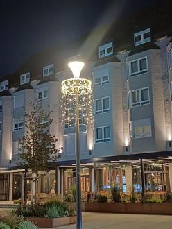 Nachdem die Bauarbeiten in der Bürgermeister-Wohlfarth-Straße weitgehend abgeschlossen sind, erstrahlt das Zentrum dieses Jahr wieder im vollen Glanz. 56 Sterne schmücken die Straßenlaternen – 21 davon brandneu mit grüner Tinselgirlande und warmweißem LED-Licht. Hinzu kommen 17 runde Laternenumhüllung mit Sternen, die die „Neue Mitte“ (zwischen Marktstraße und Gartenstraße) schmücken. Auch die Bäume auf dem Kreisverkehr Süd (Römerallee/Blumenallee) werden mit Lichterketten ausgestattet und am Infopavillon 955 wünscht ein großer Schriftzug „Frohe Weihnachten“.