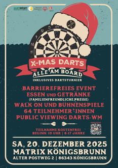 Am Samstag sind dann alle Kinder und Jugendlichen von 8 bis 17 Jahren an der Reihe. Dieses Turnier steht unter dem Motto: „Alle am Board“ und wird als inklusives Dartturnier präsentiert. Teilnehmerinnen und Teilnehmer mit und ohne Einschränkungen werden einen unvergesslichen und spannenden Tag erleben. Die Anmeldung ist über das „Dartsport Förderzentrum Augsburg“ möglich (www.dartzentrum-augsburg.de).