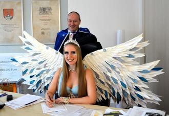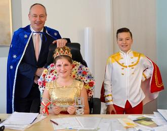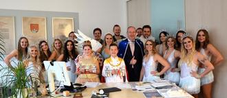 1. Bürgermeister Franz Feigl übergab traditionell die Rathausschlüssel an die beiden Prinzenpaare sowie Blumensträuße an die Prinzessinnen. Er dankte dem CCK Fantasia für die Farbe und die Stimmung, mit der der Königsbrunner Kulturpreisträger das gesellschaftliche Leben in Königsbrunn bereichere.
