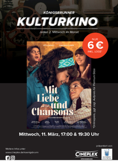 Das Königsbrunner KULTURKINO findet immer am 2. Mittwoch im Monat im Cineplex, Bürgermeister-Wohlfarth-Straße 81, zum vergünstigten Preis von nur 6 Euro inkl. Loge statt (Onlinepreis, Kinokasse 7 Euro, ggf. zzgl. Aufpreis für Premiumsitze). Alle Filminteressierten, die den Termin verpasst haben, haben die Möglichkeit, den Film auch noch im Nachgang an weiteren Terminen zu sehen – dann jedoch zum regulären Eintrittspreis.