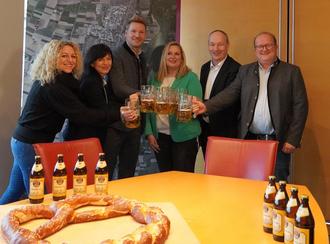 … allen Grund zum Feiern haben deshalb (v. l.): Jasemin Buchler (Leitung Bürgerdienste), Marktleiterin Jutta Steinlen, Florian Stadler (Paulaner), Désirée Papert, 1. Bürgermeister Franz Feigl und Christian Papert.