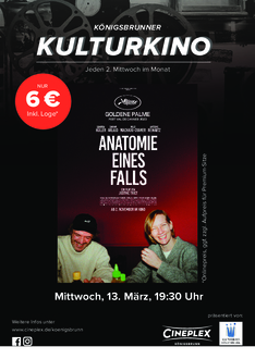 Das Königsbrunner KULTURKINO findet immer am 2. Mittwoch im Monat um 19:30 Uhr im Cineplex, Bürgermeister-Wohlfarth-Straße 81, zum vergünstigten Preis von nur 6 Euro inkl. Loge statt (Onlinepreis, Kinokasse 6,50 Euro, ggf. zzgl. Aufpreis für Premiumsitze). Alle Interessierten, die den Termin verpasst haben, haben die Möglichkeit, den Film auch noch im Nachgang an weiteren Terminen zu sehen – dann jedoch zum regulären Eintrittspreis.