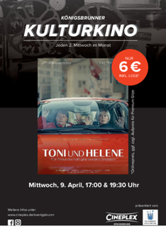 Das Königsbrunner KULTURKINO findet immer am 2. Mittwoch im Monat im Cineplex, Bürgermeister-Wohlfarth-Straße 81, zum vergünstigten Preis von nur 6 Euro inkl. Loge statt (Onlinepreis, Kinokasse 7 Euro, ggf. zzgl. Aufpreis für Premiumsitze). Alle, die den Termin verpasst haben, haben die Möglichkeit, den Film auch noch im Nachgang an weiteren Terminen zu sehen – dann jedoch zum regulären Eintrittspreis.