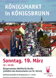 Herzlich willkommen beim Königsbrunner Marktsonntag! Am dritten März-Sonntag findet wieder unser traditioneller Königsmarkt statt: Am Sonntag, 19. März 2023, heißt es in der Bürgermeister-Wohlfarth-Straße an den zahlreichen Ständen wie immer: Kommen Sie zum Schauen, Bummeln und Genießen vorbei – es wartet allerhand Nützliches, Dekoratives, Leckeres und Informatives auf Sie!