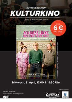 Das Königsbrunner KULTURKINO findet immer am 2. Mittwoch im Monat im Cineplex, Bürgermeister-Wohlfarth-Straße 81, zum vergünstigten Preis von nur 6 Euro inkl. Loge statt (Onlinepreis, Kinokasse 7 Euro, ggf. zzgl. Aufpreis für Premiumsitze). Alle, die den Termin verpasst haben, haben die Möglichkeit, den Film auch noch im Nachgang an weiteren Terminen zu sehen – dann jedoch zum regulären Eintrittspreis.