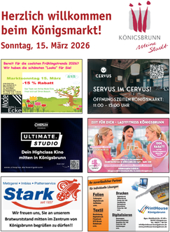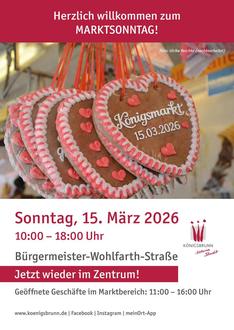 Vertraut und doch ganz neu: Am Sonntag, 15. März 2026, findet der nächste Königsbrunner Marktsonntag, der Königsmarkt, statt – wieder an seinem abgestammten Ort im Zentrum der Stadt! Nachdem die Arbeiten zur Umgestaltung der Bürgermeister-Wohlfarth-Straße soweit abgeschlossen sind, liegt der Marktbereich nun zum ersten Mal wieder im zentralen Bereich, von der Einmündung Gartenstraße / St.-Johannes-Straße bis etwa Hotel Krone.