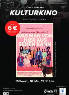 Das Königsbrunner KULTURKINO findet immer am 2. Mittwoch im Monat im Cineplex Königsbrunn, Bürgermeister-Wohlfarth-Straße 81, zum vergünstigten Preis von nur 6,00 € inkl. Loge (Onlinepreis, Kinokasse 6,50 €, ggf. zzgl. Aufpreis für Premiumsitze) statt. Alle Filminteressierten, die den Termin verpasst haben, können den Film auch noch im Nachgang an anderen Tagen sehen - dann jedoch zum regulären Eintrittspreis.
