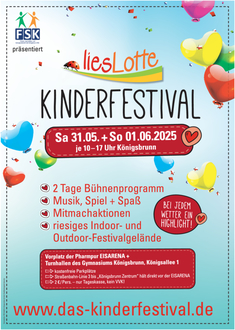 Beim dritten liesLotte-Kinderfestival in Königsbrunn stehen wieder alle Kinder und ihre Familien im Mittelpunkt. Am Wochenende 31. Mai/1. Juni 2025 findet das Festival von jeweils 10:00 bis 17:00 Uhr auf dem Vorplatz der Königsbrunner Eisarena bis in die Turnhalle des Gymnasiums statt.