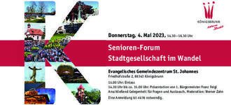 In Zusammenarbeit mit dem „Runden Tisch Senioren“ lädt die Stadt Königsbrunn erstmals zum „Senioren-Forum“. Die neue Gesprächsrunde für Seniorinnen und Senioren findet Anfang Mai statt und steht unter dem Thema „Stadtgesellschaft im Wandel“.