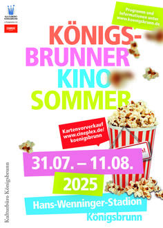 Das komplette elftägige Kinoprogramm und weitere Informationen werden ab Anfang Juli im Kulturbüro, auf unserer städtischen Homepage www.koenigsbrunn.de, in unserer App, auf Facebook und Instagram veröffentlicht!