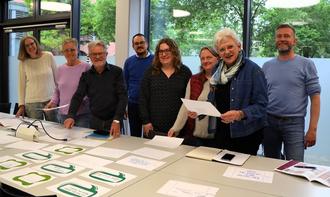 Bei so vielen tollen „Müll-Sprüchen“ der Königsbrunner Grundschülerinnen und Grundschüler hatte das Gremium die Qual der Wahl (v. l.): Ingrid Haidle, Michaela Brüggemann, Alwin Jung (Stadtrat und ehrenamtlicher Referent für Umwelt, Natur, Klima und Energie), Michael Vogt (Wirtschaftsförderung), Rebecca Fischer (Energieeffizienz und Klimaschutz), Stephanie Detke (Leitung Betriebshof), Ingrid Gärtner (Stadträtin, ehrenamtliche Referentin für Schule und Erwachsenenbildung) und Jörg Kratzer (Leitung Tiefbau), (nicht im Bild Andrea Collisi, Helmut Elias, Elisabeth Leitschuh, Christa Olbrecht).