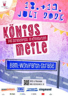 Mitte Juli wird die Königsmeile, das neue Königsbrunner Straßenfest, zwei Tage lang das Zentrum in eine fröhliche Festzone verwandeln. Am Freitag, 18. Juli 2025, stehen am Nachmittag die Kinder im Mittelpunkt. Abends und auch am Samstag, 19. Juli 2025, verwandelt sich das neugestaltete Zentrum der Stadt in eine Partymeile.