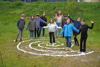 „Man muss sich sehr konzentrieren“, beschrieb ein Kind die Herausforderung beim Beschreiten des kreisförmigen Gebildes. Die Besonderheit: Man kann von zwei Seiten hineingehen und die weiße Spirale im Gras auf zwei Seiten wieder verlassen. Begegnet man sich in der Mitte, heißt es, sich darüber zu verständigen, wie man aneinander vorbeikommt, ohne die exakt ausgerichteten Steinreihen zu beschädigen. „Wenn einmal ein Stein schief liegt, kommt sofort jemand und platziert ihn wieder an der richtigen Stelle“, beobachtete Nathalie Salem-Groß. Die Kinder hätten durch das Projekt auch Achtsamkeit gelernt.