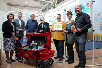 Einen ganzen Bollerwagen voll mit Utensilien für kleine Forscherinnen und Forscher übergab die Stiftung Zukina (Zukunft für Kinder und Natur) der Grundschule West in Königsbrunn. Mit den Projekten der Stiftung Zukina erkunden Kinder nicht nur Wald, Wiese und Ufer – sie erleben die Natur auch emotional, wie Stiftungsvorsitzender Heinz Matthes betonte. Und zu den sechs Sinnen der Menschen gebe es bei Zukina noch einen siebten Sinn, den Frohsinn! Denn die Kinder sollen mit Freude an die Themen herangeführt werden. Zukina gibt es seit 2014, anfangs nur mit Projekten in der Stadt Augsburg. „Dass wir nun auch im Landkreis tätig sein können, verdanken wir ausschließlich dem Engagement der Bürgerstiftung“, so Matthes weiter.