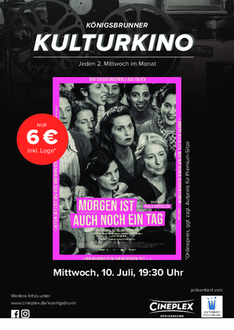 Das Königsbrunner KULTURKINO findet immer am 2. Mittwoch im Monat um 19:30 Uhr im Cineplex, Bürgermeister-Wohlfarth-Straße 81, zum vergünstigten Preis von nur 6 Euro inkl. Loge statt (Onlinepreis, Kinokasse 7 Euro, ggf. zzgl. Aufpreis für Premiumsitze).