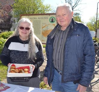 Siglinde Matysik und Rainer Linke vom Archäologischen Museum begrüßten die Radler der Staffel-Tour mit kleinen Brötchen, die nach einem römischen Rezept gebacken wurden.