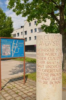 46/47 n. Chr. wurde die Via Claudia Augusta erbaut. Auf dem Königsbrunner Marktplatz informieren Stele und Schild über die wichtige römische Handelsstraße.