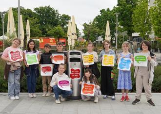 Anfang Juni durften zehn Kinder aus den Königsbrunner Grundschulen und Horten stellvertretend für ihre Klassen und Gruppen unter Mithilfe von Mitarbeitern des städtischen Betriebshofs die ersten Müllsprüche aufkleben – eine bleibende Aktion, die im Rahmen der Königsbrunner Umwelttage 2025 organisiert wurde.