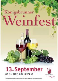 Gleich vormerken: Am ersten Freitag nach den Sommerferien, 13. September 2024, lädt Königsbrunn ab 18:00 Uhr wieder zum traditionellen Weinfest ein. Kulinarische Leckereien, viele verschiedene Weinsorten und gute Unterhaltung warten vor dem Rathaus, Marktplatz 7, auf Sie!