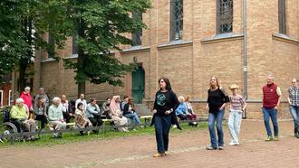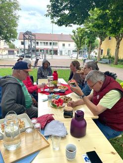 Gute Tradition ist es geworden – ein Dank an dieser Stelle auch an die evangelische Gemeinde St. Johannes –, dass man sich beim interkulturellen Treff „Café Mosaik“ des Mehrgenerationenhauses bei schönem Wetter in den Sommermonaten nach draußen begibt: Mit inzwischen eigens angeschafften Biertischgarnituren wird dann auf der Wiese unter den Kastanienbäumen neben St. Johannes und Mehrgenerationenhaus mit mitgebrachtem Essen und Trinken gepicknickt.