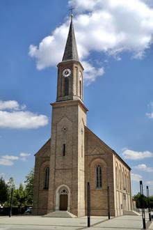 Bald wurde es notwendig, für die Gläubigen beider Konfessionen jeweils eine Kirche zu bauen. Die katholische Kirche wurde unter das Patronat des Hl. Ulrich gestellt. Im Zusammenhang mit der 900-Jahr-Feier der Lechfeldschlacht am 10. August 1855 fand die Grundsteinlegung statt. Am Anfang stand nicht nur das Gedenken an Bischof Ulrich, der als unermüdlicher Seelsorger und Verteidiger der Stadt Augsburg gefeiert wurde. Auch der nationale Gedanke der Einigung Deutschlands und des Sieges der Zivilisation gegen die Barbarei wurden mit dem Bau der Kirche in Verbindung gebracht.