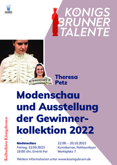 Am 22. September 2023 wird das Königsbrunner Rathaus zum Laufsteg: Die 26-jährige Königsbrunner Maßschneidermeisterin und Modellmacherin Theresa Petz präsentiert hier ihre Abschlusskollektion der Deutschen Meisterschule für Mode/Designschule München, mit der sie die Fachjury beeindrucken konnte und den zweiten Platz des Münchener Modepreises 2022 holte.
