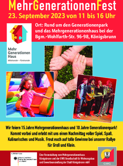 Das wollen wir zusammen feiern und laden alle herzlich zum Generationenfest am 23. September 2023 auf die Wiese zwischen MGH und Generationenpark (hinter der Kirche St. Johannes) ein. Zu Beginn um 11 Uhr eröffnet der Generationenchor das Fest. Nach der Begrüßung durch 1. Bürgermeister Franz Feigl und Günther Riebel, Geschäftsführer der GWG, können die verschiedenen Spiel- und Mitmachstationen entdeckt werden. Ein besonderes Highlight für die Kinder wird bei gutem Wetter wieder der MGH-Spieleanhänger mit der Hüpfburg sein. Ein echter Hingucker ist zudem die Vernissage im Foyer des Generationenparks (Dietrich-Bonhoeffer-Straße 40), die den gesamten Tag über geöffnet sein wird. Ab 12:30 Uhr sorgen das Café Mozart und das Team des interkulturellen Treffs „Café Mosaik“ für das kulinarische Wohl.