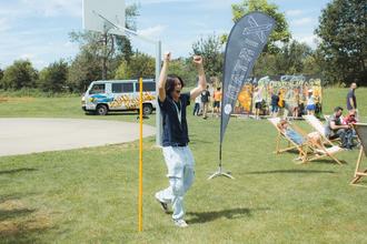 Auf dem großzügigen Außengelände gab es zahlreiche sportliche Aktivitäten, darunter Basketball, BMX- und Skateboardfahren. Besonders die Klimmzugstange war ein Highlight. Außerdem konnten die Jugendlichen ihr Talent im Schwindelfußball austesten.