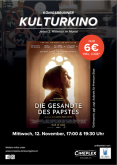 Das Königsbrunner KULTURKINO findet immer am 2. Mittwoch im Monat im Cineplex, Bürgermeister-Wohlfarth-Straße 81, zum vergünstigten Preis von nur 6 Euro inkl. Loge statt (Onlinepreis, Kinokasse 7 Euro, ggf. zzgl. Aufpreis für Premiumsitze). Alle, die den Termin verpasst haben, haben die Möglichkeit, den Film auch noch im Nachgang an weiteren Terminen zu sehen – dann jedoch zum regulären Eintrittspreis.