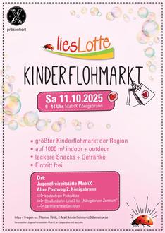 Am Samstag, 11. Oktober 2025, findet von 9:00 bis 14:00 Uhr wieder der beliebte „liesLotte-Kinderflohmarkt“ in der Jugendfreizeitstätte MatriX im Alten Postweg 2 statt. Viele Wochen zuvor sind die begehrten Tische im Innenbereich schon vergeben und über 100 private Verkäuferinnen und Verkäufer bieten ihre gebrauchten Kindersachen an, z.B. Kinderkleidung, Kinderschuhe, Spielzeug, Bücher oder auch Babyausstattung. Das ganze MatriX-Team freut sich über zahlreiche Besucherinnen und Besucher, über Familien und Kinder, die die Gelegenheit nutzen, um Schnäppchen zu machen und über den Flohmarkt zu schlendern.
