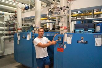 Im Technikraum des Rother Freizeitbads zeigt Badbetriebsleiter Matthias Schubert die alten Heizkessel, welche zeitnahgetauscht werden müssen.