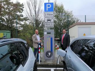 Erster Bürgermeister Andreas Buckreus (li.) und Werkleiter Dr. Gerhard Brunner (re.) laden ihre E-Autos an der neue E-Tankstelle in der Veit-Stoß- Straße auf.