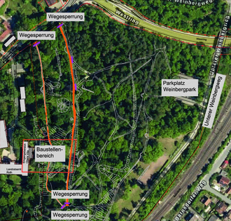 Um den Baustellenbetrieb mit den massiven Erd- und Natursteinarbeiten in der mehrmonatigen Bauphase bis voraussichtlich Juli nicht zu stören, werden die beiden Zugänge am Weinbergweg gesperrt (siehe Lageplan). Für diese Zeit ist ausschließlich der Zugang über den Unteren Weinbergweg zu benutzen.