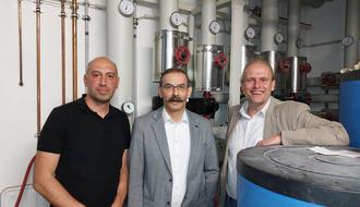 Atilla Caglayan, Leiter der Gasversorgung der Stadtwerke Roth, Dipl.-Ing. FH Karlheinz Vogt, Ö.b.u.v. Sachverständiger der HWK Mittelfranken für das Installateur- und Heizungsbauerhandwerk und Dr. Gerhard Brunner, Werkleiter der Stadtwerke Roth im Heizraum der Stadtwerke Roth.