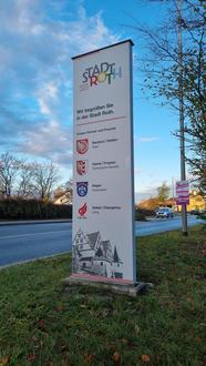 Die Rother Stelen an den Ortseingängen erstrahlen seit Kurzem im neuen Glanz. Sie präsentieren allen Gästen der Stadt Roth die verschiedenen Städtepartner oder verabschieden sie auf ein baldiges Wiedersehen.