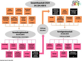 Der Gesamthaushalt hat eine Summe von rund 94,19 Millionen Euro. Damit fällt der Gesamthaushalt insgesamt gegenüber dem Vorjahr um 2,89 Prozent geringer aus. Der Verwaltungshaushalt, in dem die laufenden Einnahmen und Ausgaben verbucht werden, ist mit einer Summe von 69,68 Millionen Euro um 2,34 Prozent gestiegen und der Vermögenshaushalt mit seinen Investitionen um 15,20 Prozent auf 24,52 Millionen Euro gesunken.