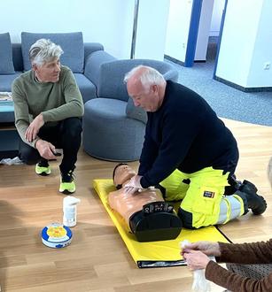 Die Mitarbeiter*innen, die bereits die Befähigung zum betrieblichen Ersthelfer haben, müssen gemäß den Vorgaben der Berufsgenossenschaft alle zwei Jahre ihre Kenntnisse auffrischen und Neuerungen kennenlernen.