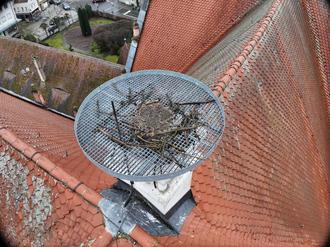 Seit drei Jahren brütet auf dem ehemaligen Postgebäude am Marktplatz ein Rother Storchenpaar. Die Störche sind wunderbar anzusehen, sorgen aber teilweise mit ihrem Nistplatz für Unmut. Durch die Lage des Nests direkt an der Fassade wird diese nicht nur mit dem Kot der Störche, sondern auch deren Nistmaterial und Futter in Form von toten Kleintieren beschmutzt. Das führt nicht nur zu Geruchsbelästigung, sondern vor allem zu einem extrem hohen Reinigungsaufwand, der weder finanziell noch personell gestemmt werden kann.