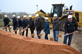 Gleich neun Spaten für die Erweiterung der Zentralkläranlage: Stefan Köhn (Geschäftsführer Erdbau Reithelshöfer GmbH), Susanne Nefzger (Leitung Vertrieb BAUER Spezialtiefbau GmbH), Thomas Hitz (Projektleiter Ingenieurbüro Dr. Resch & Partner), Landrat Ben Schwarz, Erster Bürgermeister Andreas Buckreus, Stadtbaumeister Wolfgang Baier, Regine Schatz (Geschäftsführerin Ingenieurbüro Dr. Resch & Partner), Christian Arnold (Projektleiter Stadt Roth), Andreas Ott (Leiter Kläranlage Stadt Roth) (v.l.n.r.)